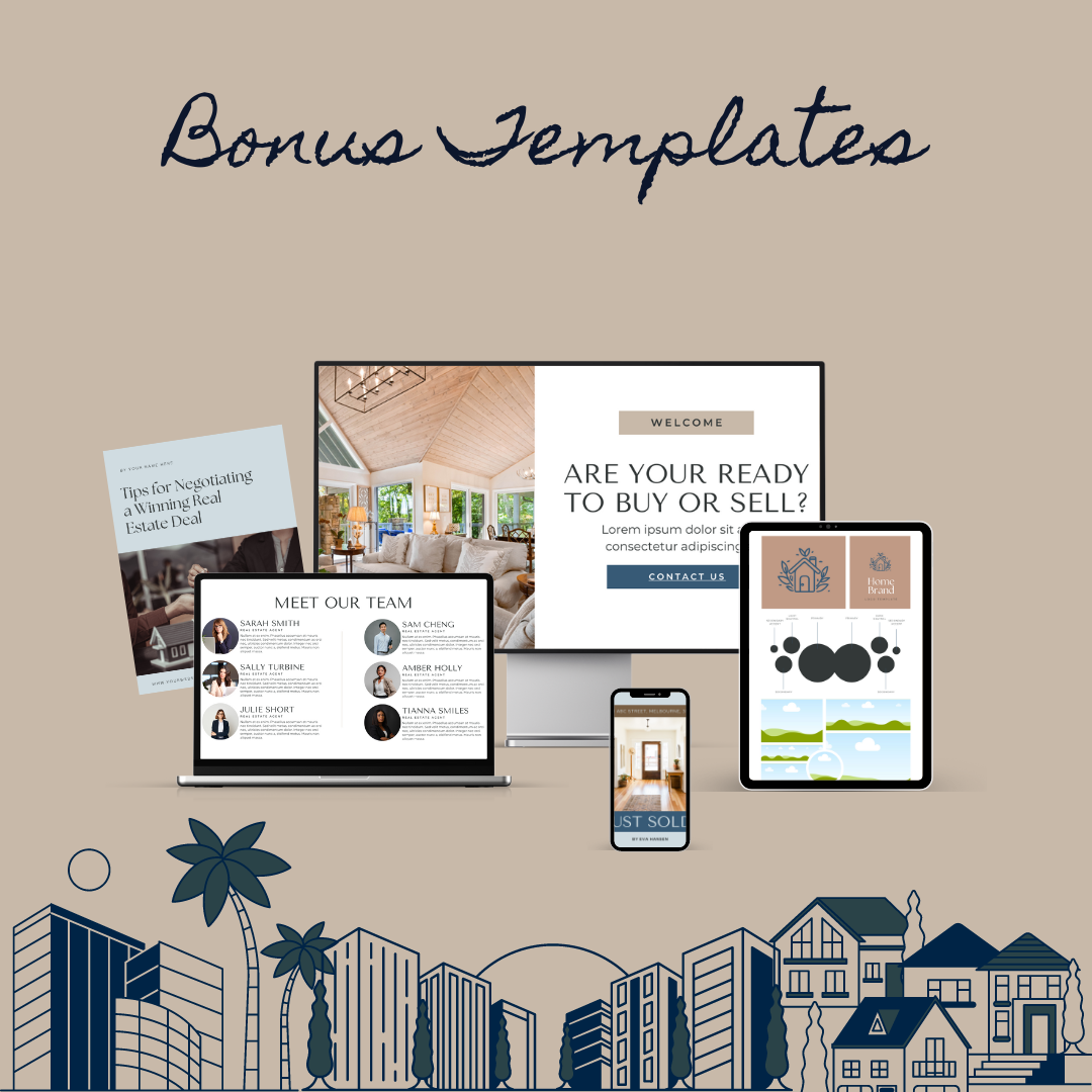 An impactful, high-quality, and comprehensive set of templates to guide you through every step of your real estate business, facilitating planning, marketing, and client engagement without needing advanced design skills!